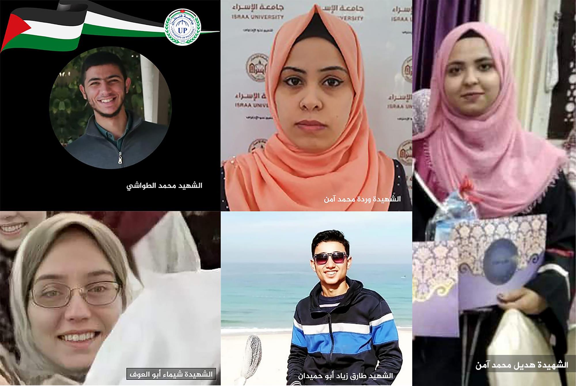 ونعت الوزارة كل شهداء فلسطين، والشهداء الطلبة الذين ارتقوا نتيجة العدوان المتواصل على القطاع وهم: الطالبة شيماء أبو العوف من جامعة الأزهر؛ والتي ارتقت في المجزرة التي ارتكبها الاحتلال في شارع الوحدة بمدينة غزة أول أمس، والطالبة وردة محمد آمن، والطالب طارق زياد أبو حميدان وكلاهما من جامعة الإسراء، والطالب محمد الطواشي من جامعــة فلسطين، والطالبة هديل محمد آمن من جامعة الأقصى.