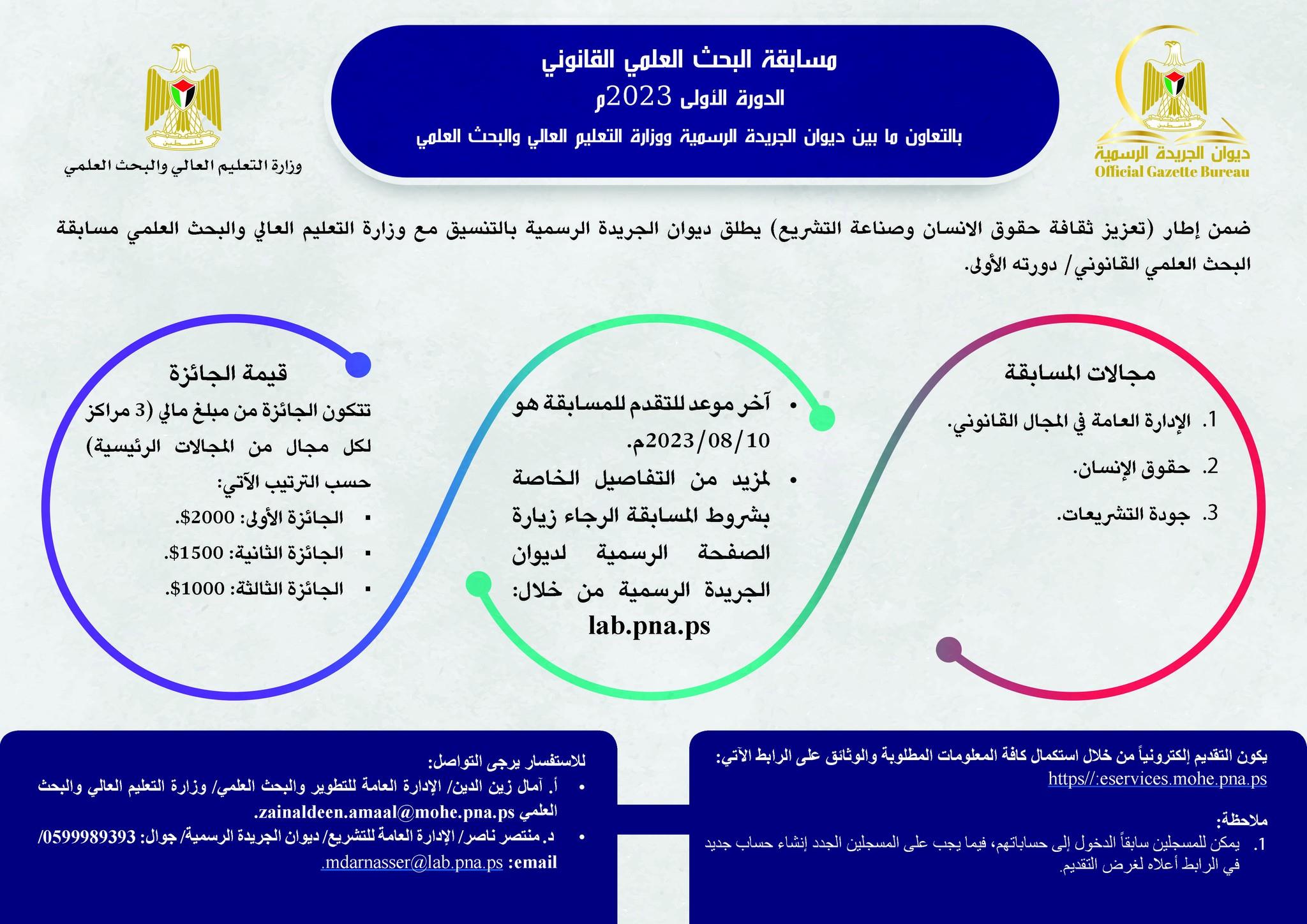 أطلقت وزارة التعليم العالي والبحث العلمي، اليوم، وبالتعاون مع ديوان الجريدة الرسمية؛ مسابقة البحث العلمي القانوني في دورتها الأولى للعام 2023م
