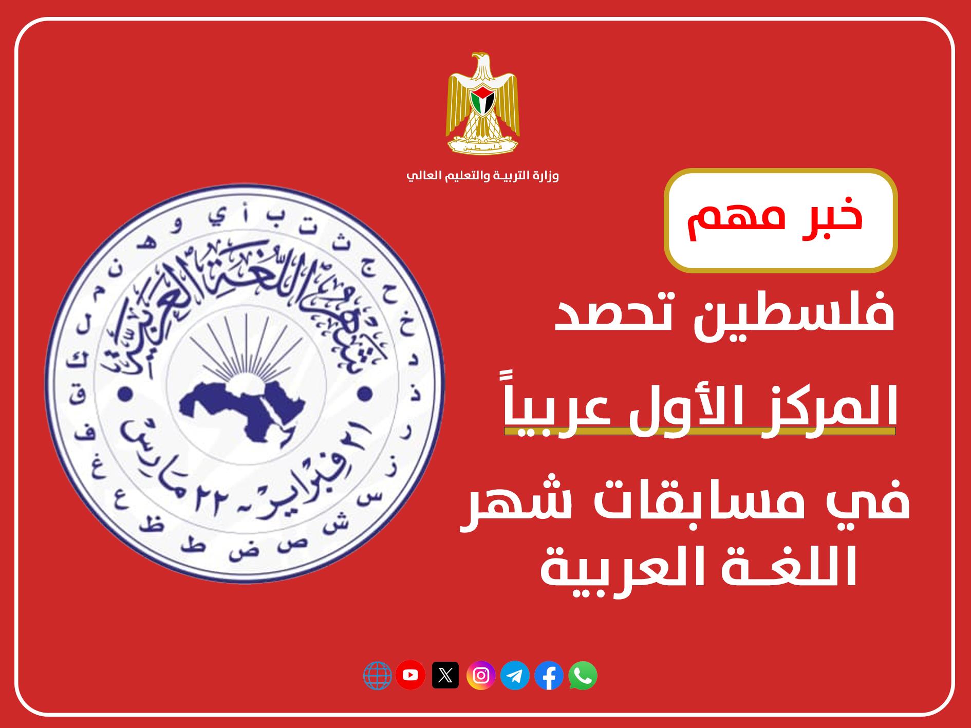أعلنت وزارة التربية والتعليم العالي، اليوم، عن تحقيق دولة فلسطين إنجازاً ثقافياً وتربوياً مميزاً بحصولها على المركز الأول على مستوى الدول العربية في مسابقات شهر اللغة العربية للدورة الأولى للعام 2025-2026، والتي أُطلقت ضمن "مُبادرة شهر اللغة العربية" تحت مظلة جامعة الدول العربية، بمشاركة واسعة من مُختلف الدول العربية.