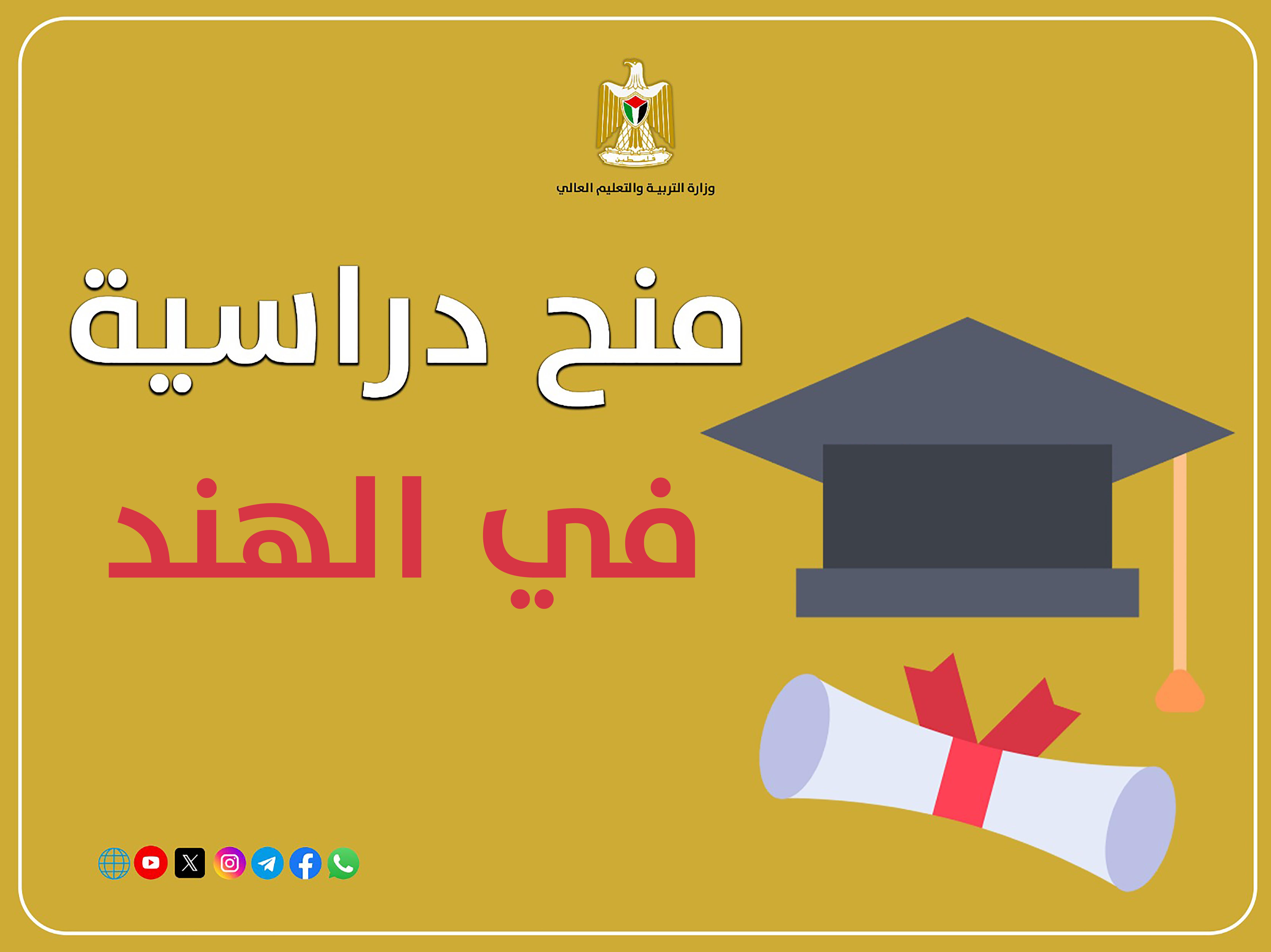 أعلنت وزارة التربية والتعليم العالي، اليوم، عن توفر عدد من المنح الدراسية في الهند للعام الدراسي 2026-2027، وذلك بمجال البكالوريوس، والدراسات العليا (ماجستير، ودكتوراة)